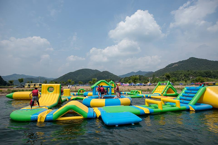 这是一款依托开阔湖面打造的无动力水上充气闯关设备,由黄、绿、蓝三色充气模块拼接而成,包含滑梯、障碍浮台、攀爬通道等丰富关卡,造型明快活泼,与湖光山色形成清新治愈的视觉效果。