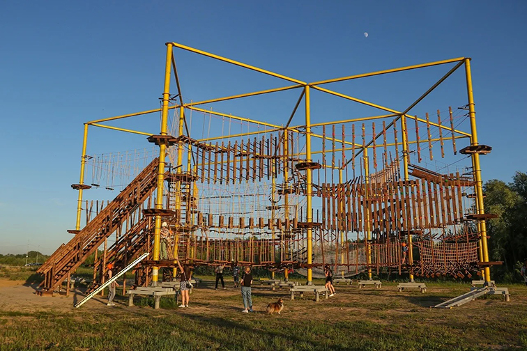 这是一款大型专业级室外拓展游乐设备,以醒目的黄色钢材框架为核心,构建出多层交错的木质关卡与绳索网阵,融合了高空行走、平衡踏板、网阵攀爬等多元挑战模块。主体采用高强度钢材搭建支撑框架,搭配防腐实木关卡与高强度绳索系统,既保障了结构稳固与游玩安全,又通过鲜明的色彩对比形成强烈的视觉冲击。设备集个人挑战与团队协作于一体,适用于户外营地、研学基地、大型主题乐园等场景,让挑战者在立体空间中锻炼体能、勇气与协作能力,沉浸式体验高空探险的刺激与乐趣。