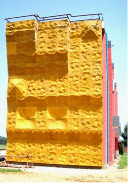 依附墙面这种方法是在现有墙壁上架设钢架结构及固定连接装置,再将岩板固定在上面,最后设定攀岩路线,装上岩块即可。由于岩壁是附着于固定物上,不容易增加高度或宽度,这是目前最普通的做法,但最主要的考虑,是岩壁结构体除了必须要能够承受板面结构的重量,以及使用者坠落时产生的冲击力量外,更要考虑这些相应力,是否会对原有建筑结构造成破坏。若岩壁设在室外则还需要考虑气候所造成的影响,对钢架的要求则视岩壁大小及外型变化而定。