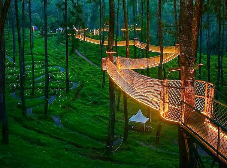 这是一款沉浸式森林主题室外拓展游乐设备,以天然林木为支撑,打造出蜿蜒穿梭于林间的高空网道与平台,搭配 LED 灯带在夜间点亮,营造出梦幻的星芒森林氛围。主体采用高强度镀锌钢丝网与钢材框架构建,既保障了结构稳固与游玩安全,又最大程度保留了森林的自然风貌。设备集高空行走、林间穿越、夜间打卡于一体,适用于自然景区、森林营地、研学基地等场景,让游客在离地的栈道上感受森林的静谧与壮阔,同时锻炼平衡感、勇气与探索精神,是白天亲近自然、夜晚邂逅星光的理想游乐选择。