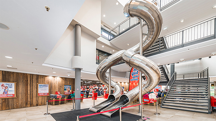 这是一款专为商业综合体打造的大型室内不锈钢螺旋游乐设备,以 304 食品级不锈钢为核心材质,采用多层盘旋的流线型设计,从高层平台蜿蜒至地面,整体如一条悬浮于中庭的 “银翼旋流”,兼具视觉冲击力与游乐体验。