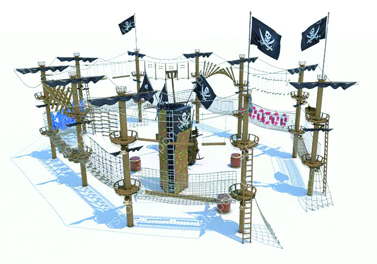 这是一款沉浸式海盗主题室外拓展游乐设备,以经典海盗船为设计灵感,融合了木质桅杆、网阵攀爬、攀岩挑战与骷髅旗等标志性元素,打造出充满冒险氛围的海盗世界。主体采用环保防腐实木搭建桅杆与平台,搭配高强度尼龙网阵与玻璃钢攀岩墙,既还原了海盗船的复古质感,又保障了结构稳固与游玩安全。设备集攀爬穿越、平衡挑战、亲子互动于一体,适用于主题乐园、亲子景区、研学基地等场景,让孩子们在沉浸式的海盗探险中锻炼体能、勇气与团队协作能力,开启一段充满惊喜的航海冒险之旅。