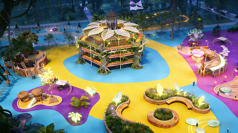 这是一款沉浸式奇幻风格室外拓展游乐设备,以荧光森林秘境为设计灵感,打造出多层错落的树屋平台、蜿蜒栈道与发光互动装置,搭配大面积彩色地面与仿真绿植,营造出梦幻的夜间探险氛围。主体采用环保防腐实木搭建树屋与栈道,搭配高强度钢材框架与 LED 灯光系统,既保障了结构稳固与游玩安全,又通过鲜明色彩与发光装置形成强烈视觉冲击。设备集高空行走、亲子互动、沉浸式打卡于一体,适用于主题乐园、文旅综合体、研学基地等场景,让游客在奇幻森林中锻炼平衡感、勇气与探索精神,开启一段充满惊喜的荧光探险之旅。