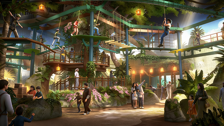 这是一款沉浸式室内拓展游乐设备,以热带雨林为设计灵感,打造出多层错落的木质栈道、树屋平台与攀爬网阵,搭配仿真绿植与暖光氛围灯,营造出逼真的丛林秘境氛围。主体采用环保防腐实木搭建栈道与树屋,搭配高强度钢材框架与尼龙网阵,既保障了结构稳固与游玩安全,又还原了雨林探险的自然质感。设备集高空行走、网阵攀爬、亲子互动于一体,适用于室内主题乐园、文旅综合体、研学基地等场景,让游客在沉浸式的雨林环境中,锻炼平衡感、勇气与团队协作能力,开启一段充满未知与惊喜的室内探险之旅。